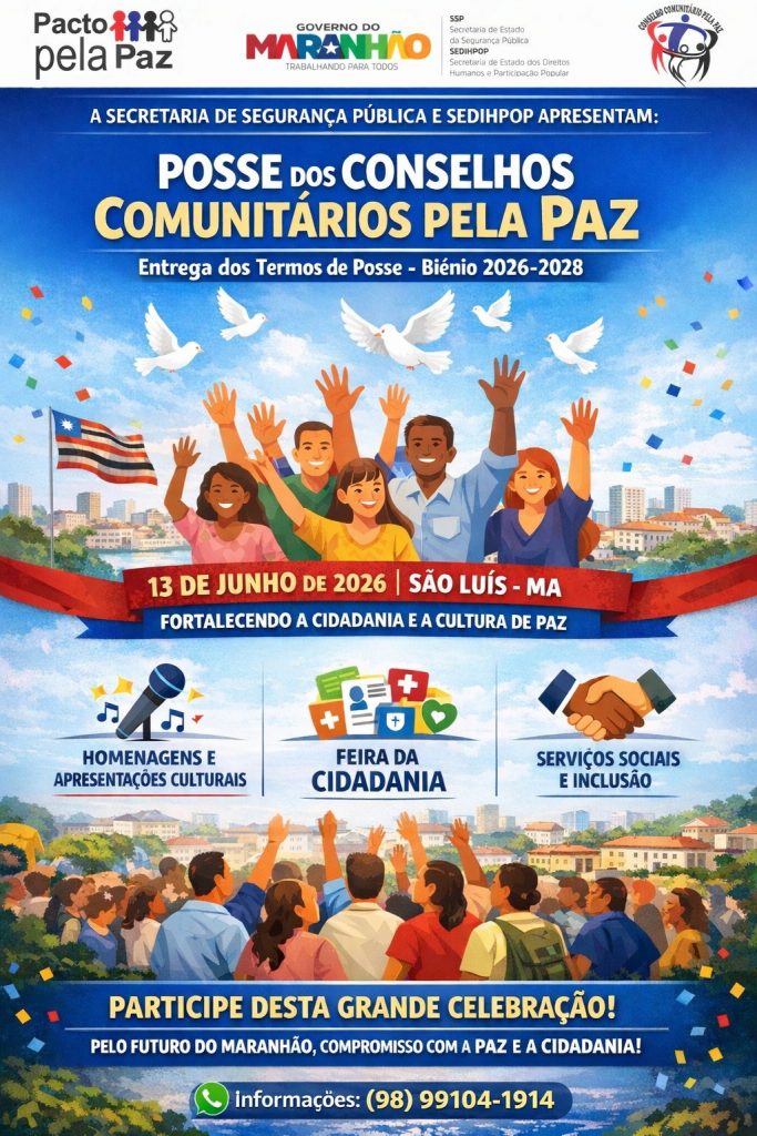 O Programa Pacto Pela Paz realizará, no dia 13 de junho de 2026, em São Luís (MA), um grande evento social para a entrega dos Termos de Posse aos Conselhos Comunitários Pela Paz, eleitos para o biênio 2026–2028.