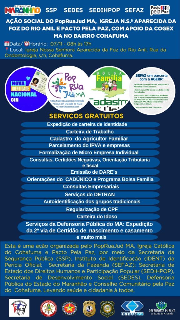 Nesta sexta-feira (07/11), o bairro do Cohafuma, em São Luís, receberá uma grande ação social coordenada pelo PopRuaJudMA, com o apoio do Programa Pacto Pela Paz (SSP/MA), Instituto de Identificação (Perícia Oficial do Maranhão), Defensoria Pública, Sedihpop, Cogex, Igreja Nossa Senhora Aparecida da Foz do Rio Anil, Conselho Comunitário Pela Paz do bairro e diversos outros parceiros.