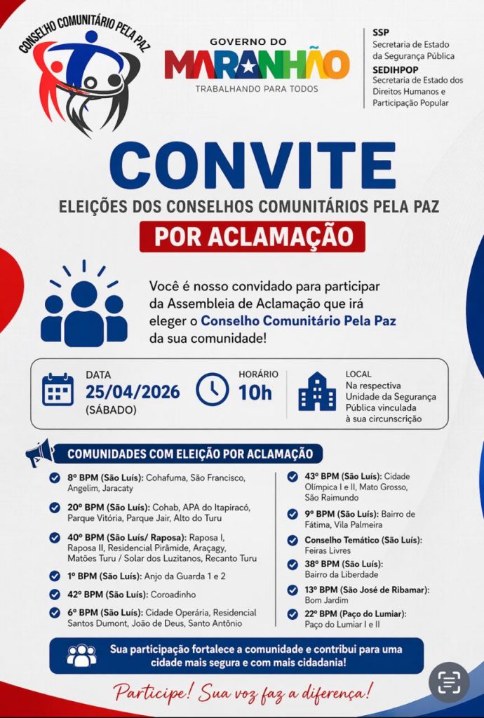 A Secretaria de Estado da Segurança Pública do Maranhão e Secretaria de Estado de Direitos Humanos, por meio do Programa Pacto Pela Paz, realiza neste sábado, dia 25 de abril de 2026, uma das etapas mais importantes do processo eleitoral dos Conselhos Comunitários Pela Paz (CCP), referente ao biênio 2026–2028.