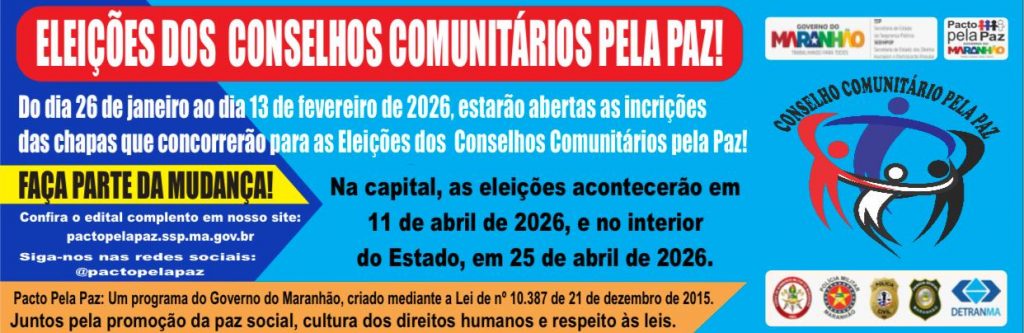O Programa Pacto Pela Paz realizou, na última segunda-feira (20), uma palestra com o tema “Eleições dos Conselhos Comunitários Pela Paz – Biênio 2026–2028”, no auditório da UEMANET, em São Luís. O encontro teve como objetivo orientar e alinhar os Membros Natos dos Conselhos Comunitários Pela Paz quanto aos procedimentos, responsabilidades e etapas do processo eleitoral que ocorrerá em todos os 217 municípios maranhenses.